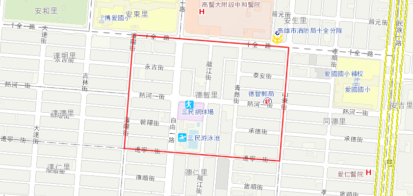 里界東至山東街,西至瀋陽街,南至遼寧一街,北至十全一路。 |